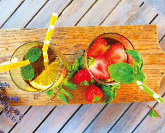 - Schenk de ijsthee in een glas, voeg wat ijsklontjes toe en versier het glas met een takje basilicum.