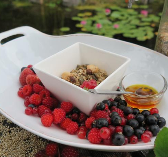 Zet in de tussentijd de oven aan op 140 graden. Laat eventueel de kokosolie smelten. Spreid alle ingrediënten (met uitzondering van de quinoa) uit over een bakplaat en meng ze goed. Meng het zout met de olie en verdeel dit over het mengsel. Zet circa een half uur in de oven op 130 graden. Om de 8-10 minuten alles even doorscheppen. De gepofte quinoa erdoor mengen en af laten koelen. Goed afgesloten bewaren in een dichte trommel/pot. Voeg met servering rood fruit toe. Smakelijk!