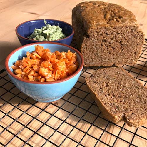 Tip 2: **als je dit brood eenmalig maakt hoef je de agar agar en psyllium niet perse te gebruiken. Maar als je regelmatig je eigen brood bakt of weinig brood eet, is het van wezenlijk belang dat je voldoende jodium krijgt. In dit brood wordt jodium geleverd door vooral de agar agar, de kwark en de eieren. Als je dit brood eenmalig eet hoef je ook de psyllium niet toe te voegen. Maar volg je bijvoorbeeld een paleo- of ketogeen dieet met weinig vezels erin, dan is het erg belangrijk het wel te doen. Dit brood bevat, zelfs met deze hoeveelheid noten en psyllium erin, een fractie van de vezels van normaal volkoren brood. Aangezien de sleutel van je gezondheid in je darmmicrobioom ligt is dat iets om veel aandacht aan te schenken. Kies daarom voor een heerlijk groentebeleg op dit brood. Ook erg lekker met geraspte wortel salade.