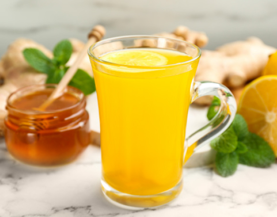 - Voeg schijfjes citroen en stukjes gember toe.