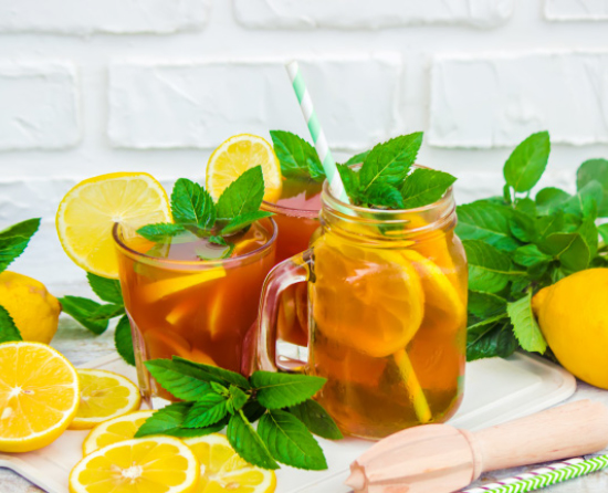 - Voeg schijfjes citroen en takjes verse munt toe.