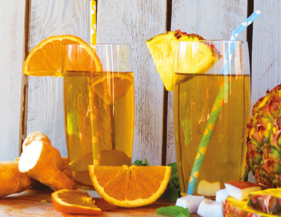 - Schenk de ijsthee in een glas, voeg ijsklontjes toe en versier het met een half schijfje sinaasappel.